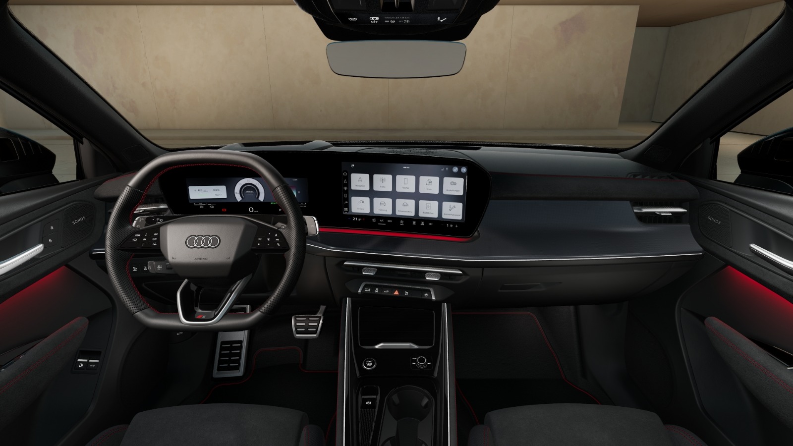 Wnętrze / praktyczność: sportowa kierownica 3-ramienna spłaszczona u góry i dołu, multifunkcyjna z łopatkami, sportowe fotele S line obszyte mikrofibrą, 4-kierunkowa regulacja podparcia lędźwiowego, ciemne aluminiowe aplikacje Divergenz, czerwone przeszycia Audi Sport, tylne siedzenia plus, elektrycznie otwierana i zamykana klapa bagażnika, i-Size / ISOFIX także z przodu, dywaniki przód/tył